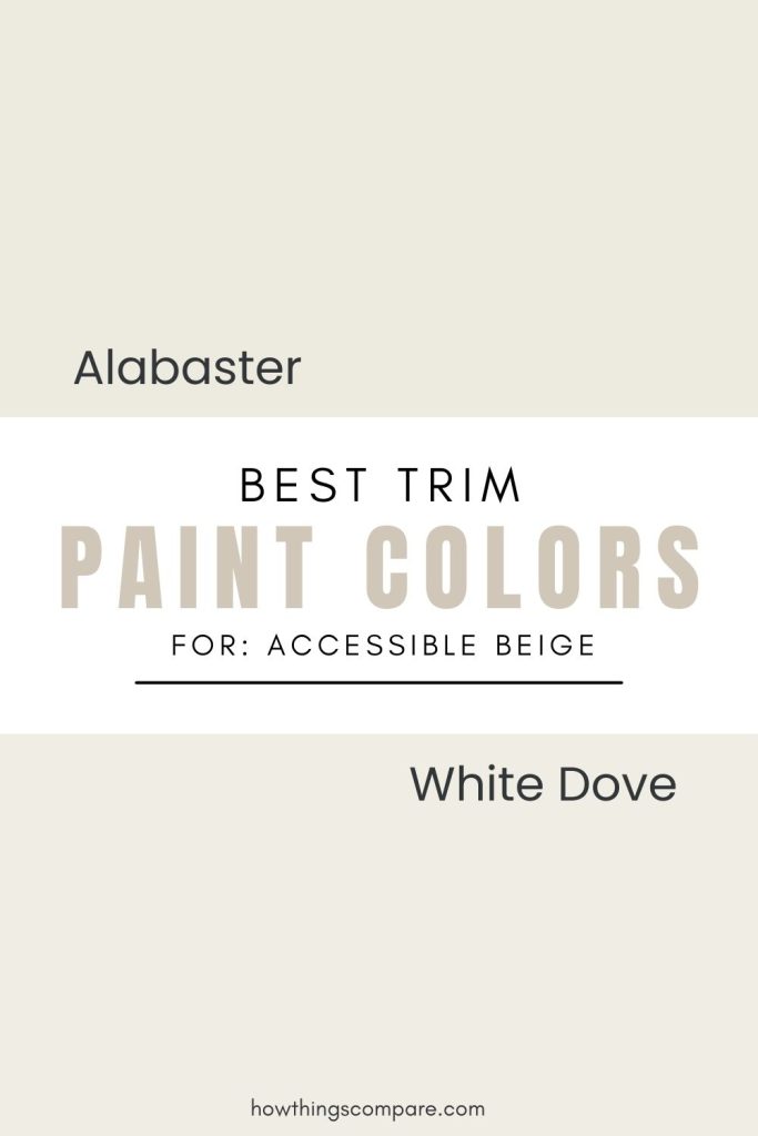 Great options to consider are Sherwin-Williams Alabaster (SW 7008) and Marshmallow (SW 7001), or Benjamin Moore White Dove and Cotton Balls (OC-122). All of these sit in the warm white family and will keep your space feeling pulled together and harmonious. Just avoid bright, cool whites like Extra White or Chantilly Lace as they can clash with Accessible Beige’s warm undertones and make the overall palette feel disconnected.