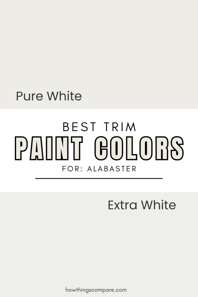 If you want a soft, warm contrast, Sherwin-Williams Pure White (SW 7005) is a popular choice that stays in the same warm family as Alabaster without competing with it. For a crisper, more defined edge, Sherwin-Williams Extra White (SW 7006) or High Reflective White will give you that clean contrast — just keep in mind that the brighter and cooler your trim color, the more Alabaster’s warm and creamy undertones will show up on the walls.