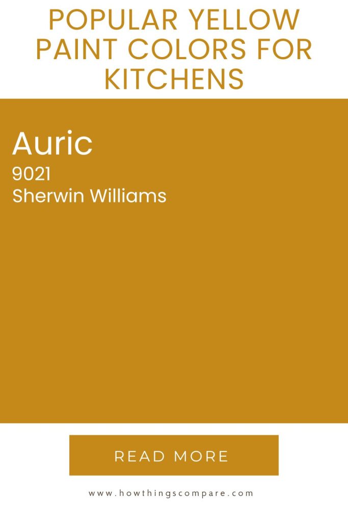 I’m a huge fan of Auric paint color. Auric leans golden rather than pure yellow, with a richness that feels almost metallic in warm light. It’s one of the deeper picks on this list — better suited to kitchens with good natural light or rooms where you want a cozy, enveloping feel. Pairs well with dark hardware, walnut cabinets, and natural stone countertops.