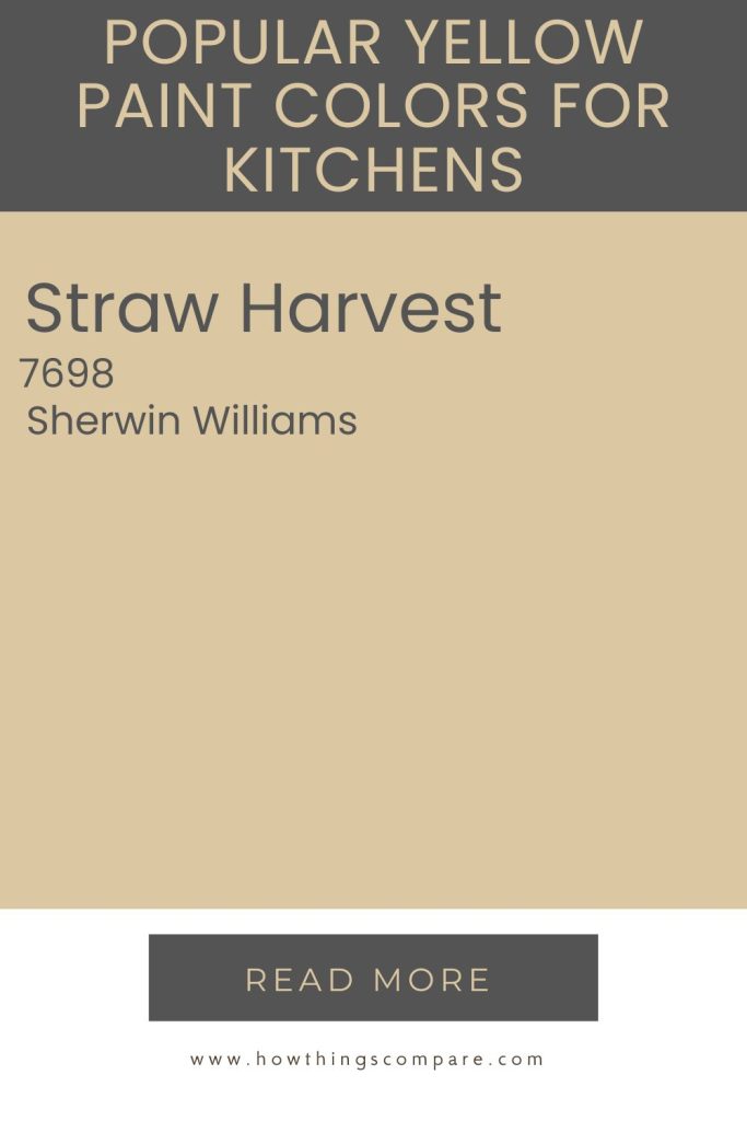 Another great choice is Straw Harvest. This color is a warm, earthy yellow with strong golden-beige undertones that keep it grounded. It sits closer to harvest gold than true yellow, giving it a natural, organic feel that works well in farmhouse or transitional kitchens. Because it reads more neutral than yellow in some lighting conditions, it’s a good option if you want warmth on the walls without the room feeling overtly colorful.