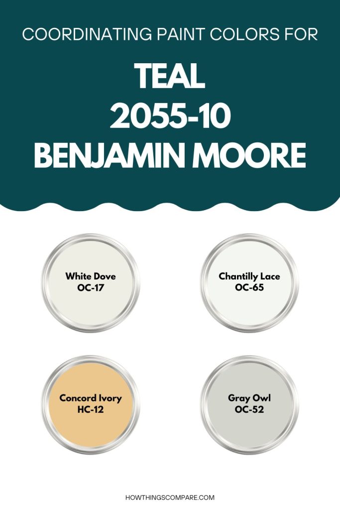 - White Dove (OC-17) by Benjamin Moore: A soft, warm white that creates a clean and classic contrast against Teal, working beautifully on trim, ceilings, and adjacent walls.